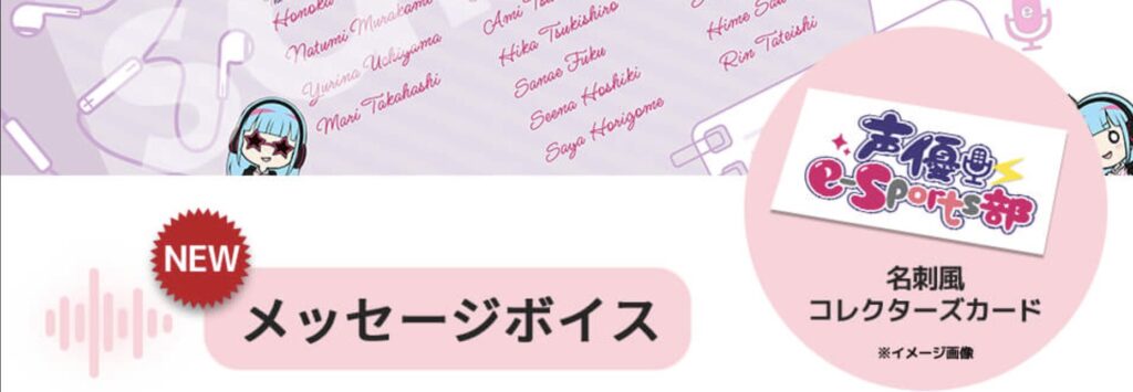 声優e-Sports部のコラボPCを購入すると、メッセージボイスや名刺風コレクターズカードなどの特典がもらえます。
