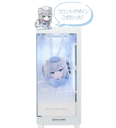 NachonekoのコラボPCは、PCケースのフロントやサイドにNachonekoのイラストがあしらわれているのが特徴です。